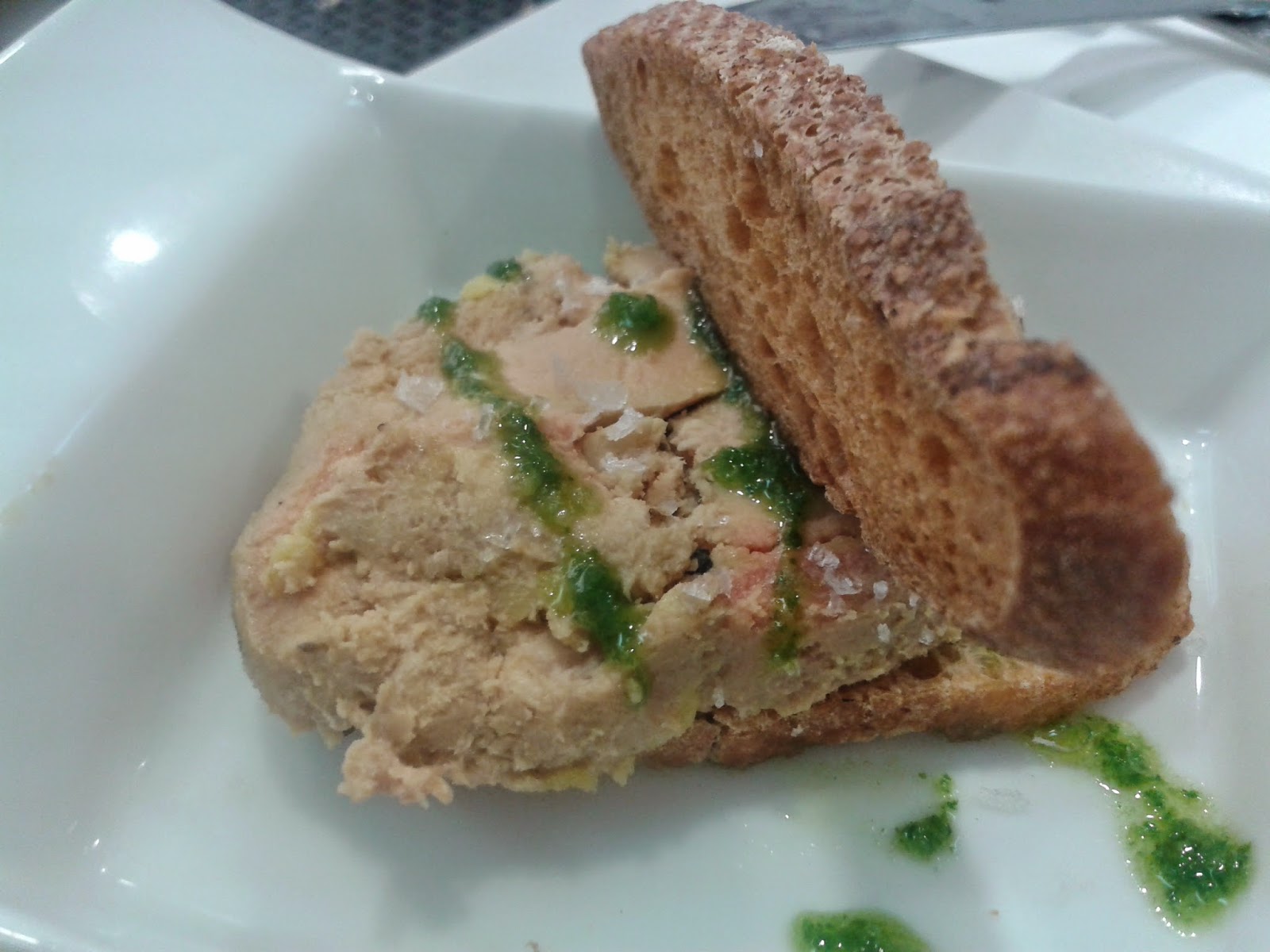 Seguidamente nos trajeron el foie mi-cuit con Trufa y Aceite de Perejil. El sabor era muy suave y agradable. Quizás se echaba en falta un poco más de salsa ya que el sabor del foie tapaba un poco a ésta, pero aún así los sabores casaban perfectamente, en un bocado mucho más que generoso.